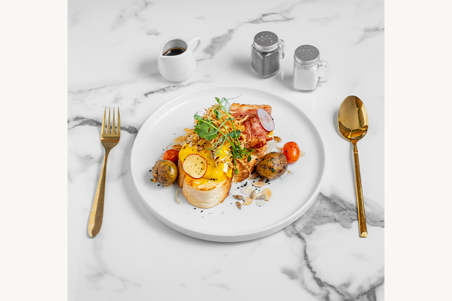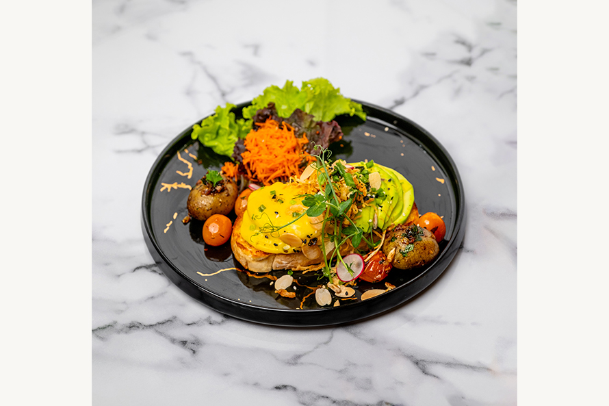 crispy french bread,garlic butter,pouch egg,mushroom,tomato cherry,vegetable,mix lettuce,hollandaise